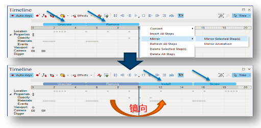 在制作裝配動(dòng)畫(huà)的時(shí)候,一般都是先制作拆的動(dòng)作,然后反轉(zhuǎn)。很多時(shí)候,反轉(zhuǎn)之后,要做很多關(guān)鍵幀的調(diào)整,不然會(huì)有錯(cuò)亂。