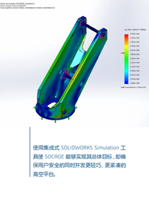 除利用SOLIDWORKS 設(shè)計工具(如在平臺被展開和移動時利用設(shè)計配置來捕捉每個位置)和自動創(chuàng)建最 優(yōu)工具外,SOCAGE 還依賴集成式 SOLIDWORKS Simulation 軟件來實現(xiàn)其總體目標,即確保用戶安全的同時開發(fā)更輕巧、更緊湊的高空平臺。