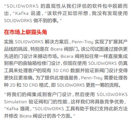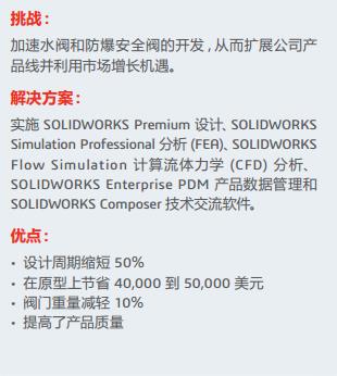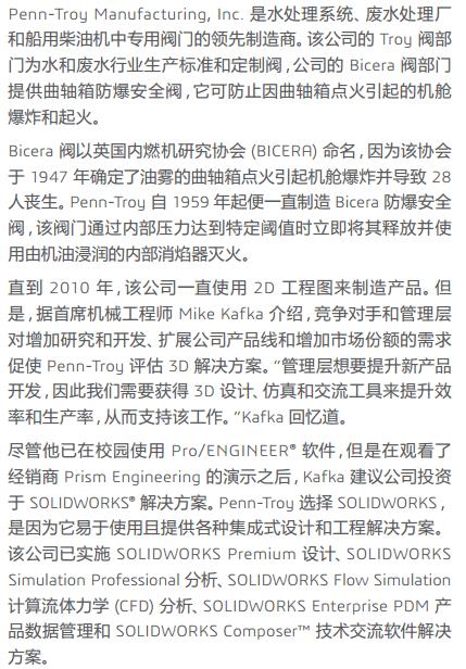 Penn-Troy Manufacturing 利用 SOLIDWORKS設(shè)計、仿真、 CFD 分析、 PDM 和技術(shù)交流解決方案來縮短設(shè)計周期、提高質(zhì)量、減少原型并擴展其專業(yè)水和防爆安全閥系列。